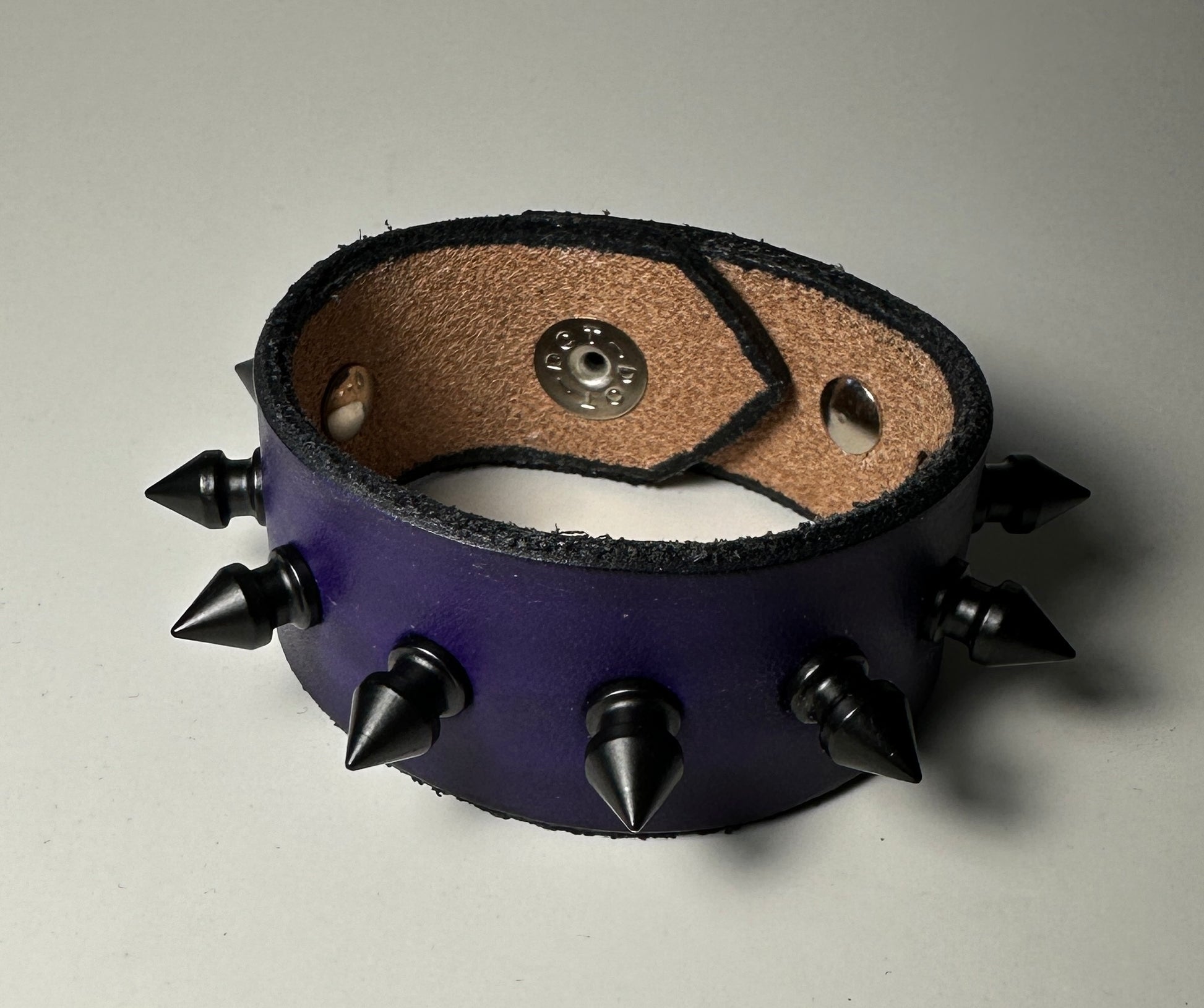 This is a hand dyed 1.25” veg tan wristband set with the 1/2” black tree spikes. This is a head turner.
